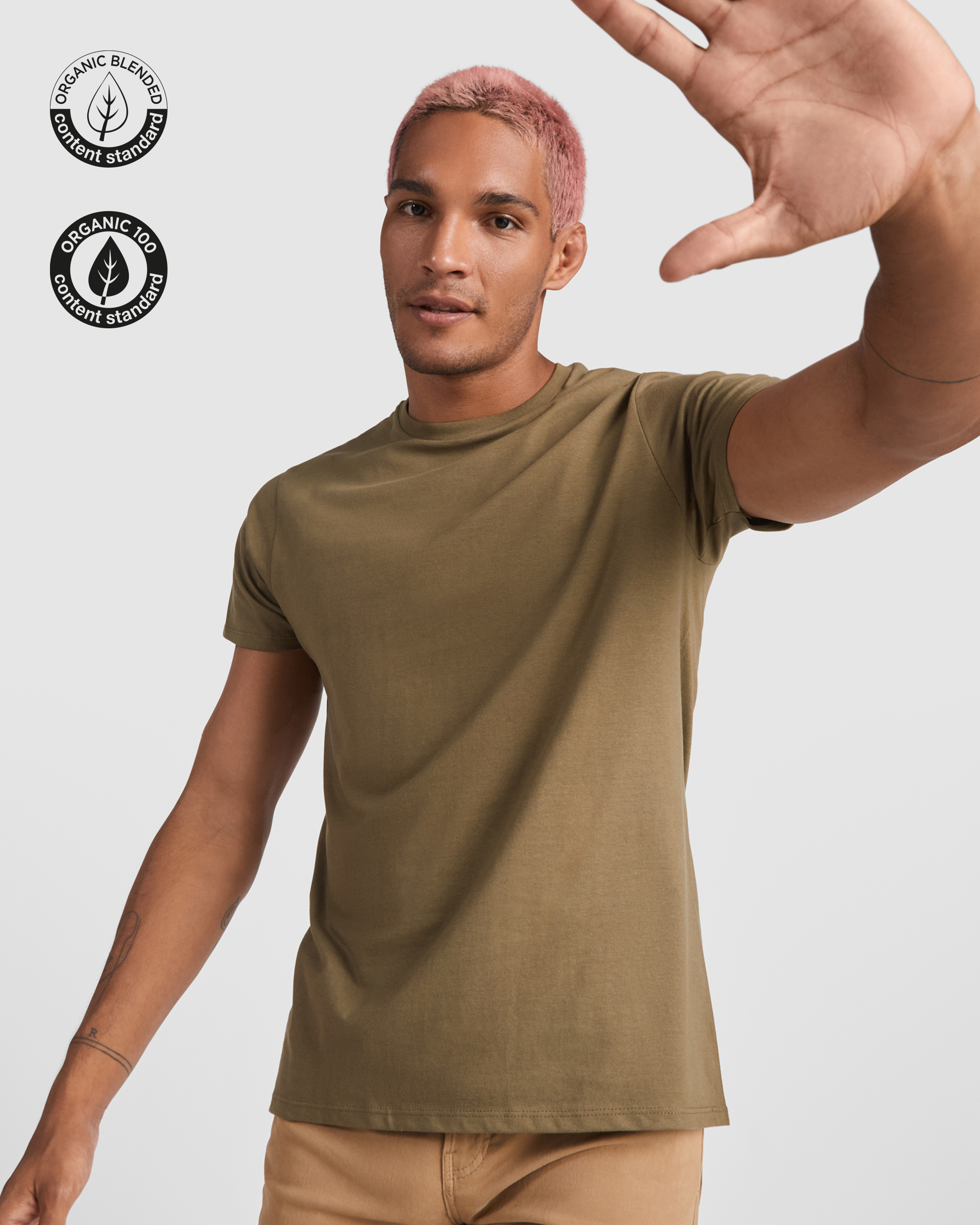 Camiseta tubular de manga corta en algodón orgánico certificado OCS. Cuello redondo en canalé 1×1. Cubrecosturas reforzado en cuello.