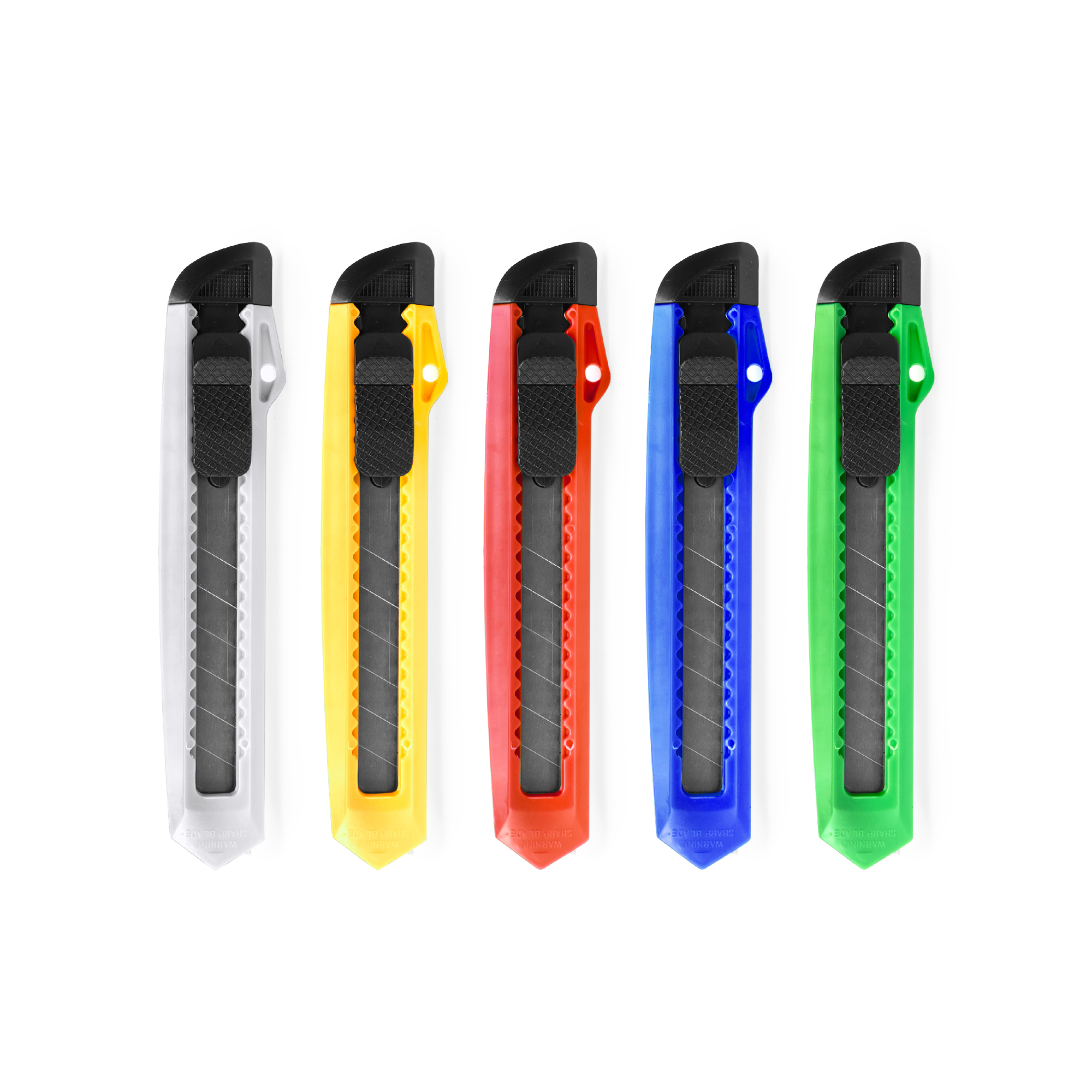 Cutter de cuchilla ancha y cuerpo de ABS. Agarre ergonómico troquelado y capucha extraíble para el corte y ajuste de la cuchilla.