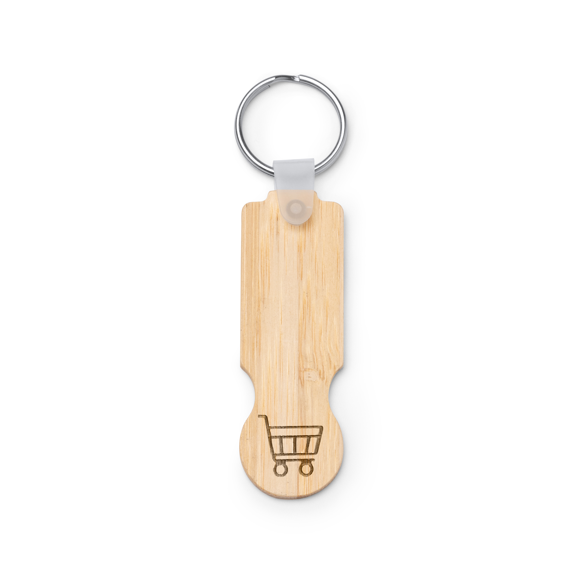 Llavero de bambú con moneda para el carro de la compra. Amplia zona de marcaje. Composición: Bambú