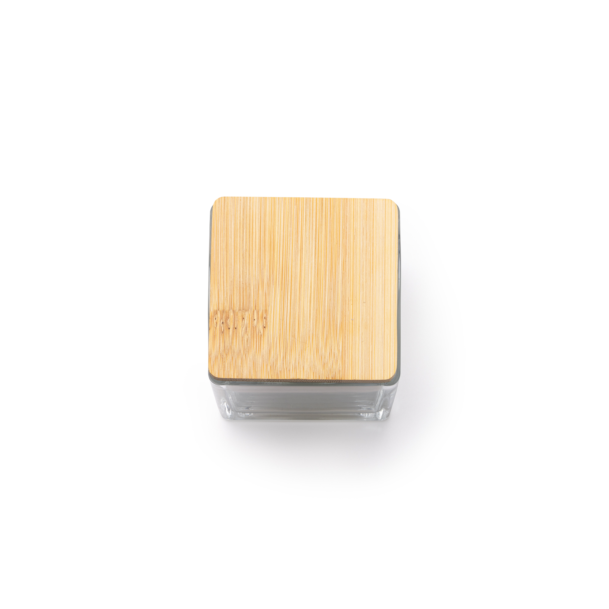 El recipiente de cristal le da un toque sofisticado a la vela, permitiendo que la luz de la llama se refleje de manera suave y sutil. La tapa de bambú no solo añade un elemento natural y decorativo, sino que también ayuda a mantener la fragancia de la vela cuando no está en uso.