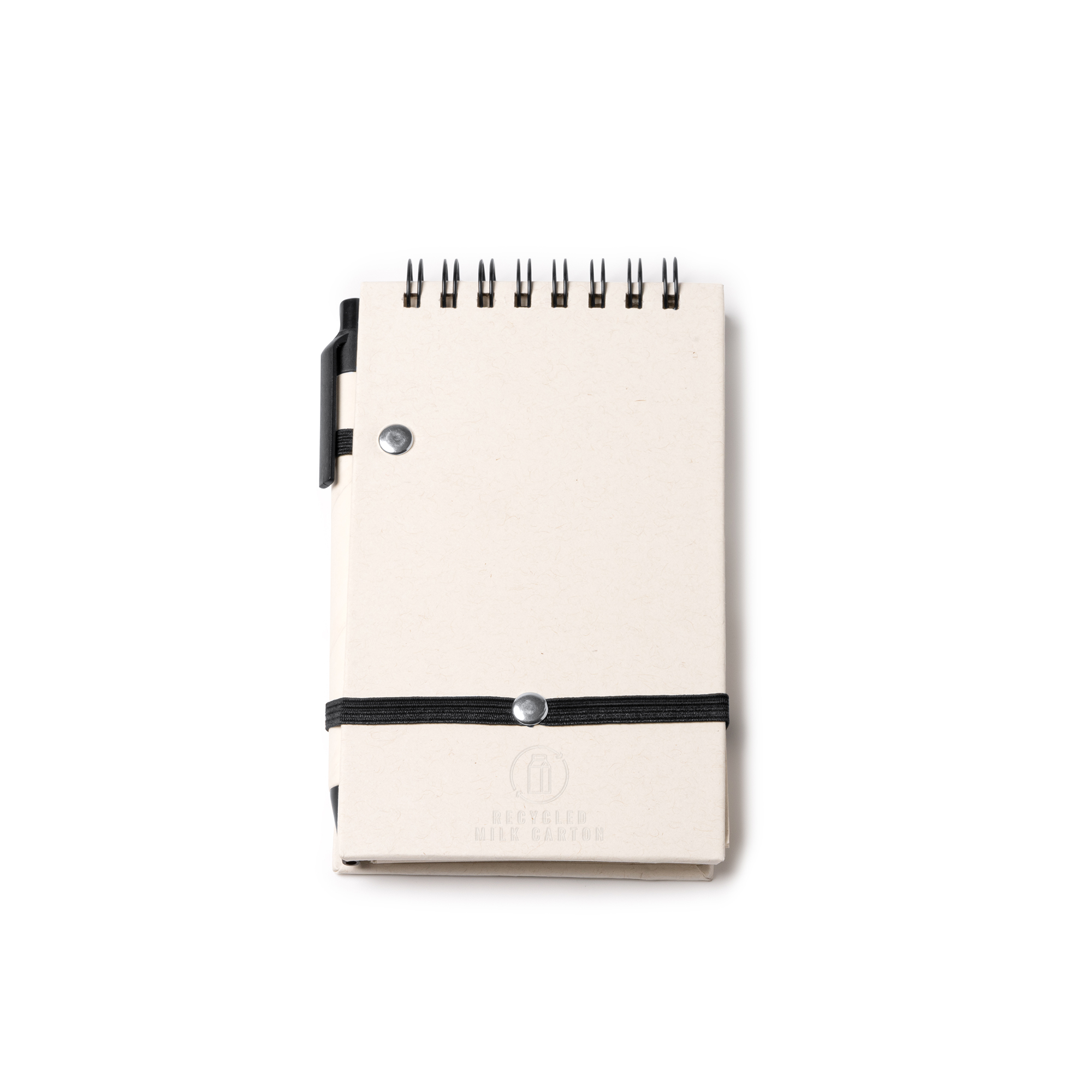 Libreta A6 realizada en cartón reciclado de briks de leche. Incluye banda elástica y bolígrafo de tinta azul. 80 hojas a rayas.