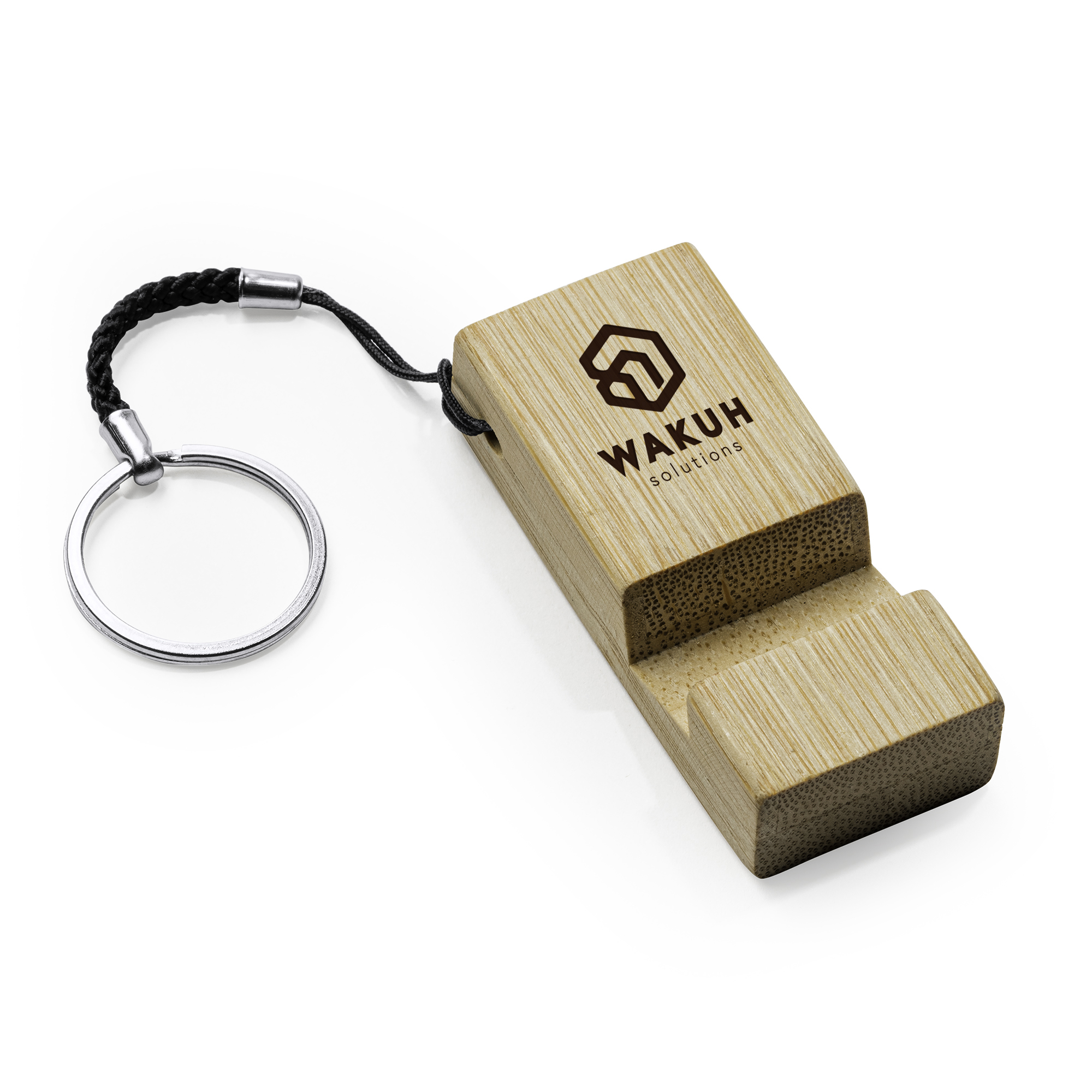 Llavero con función soporte para el móvil realizado en bambú.
